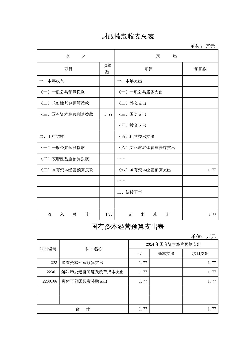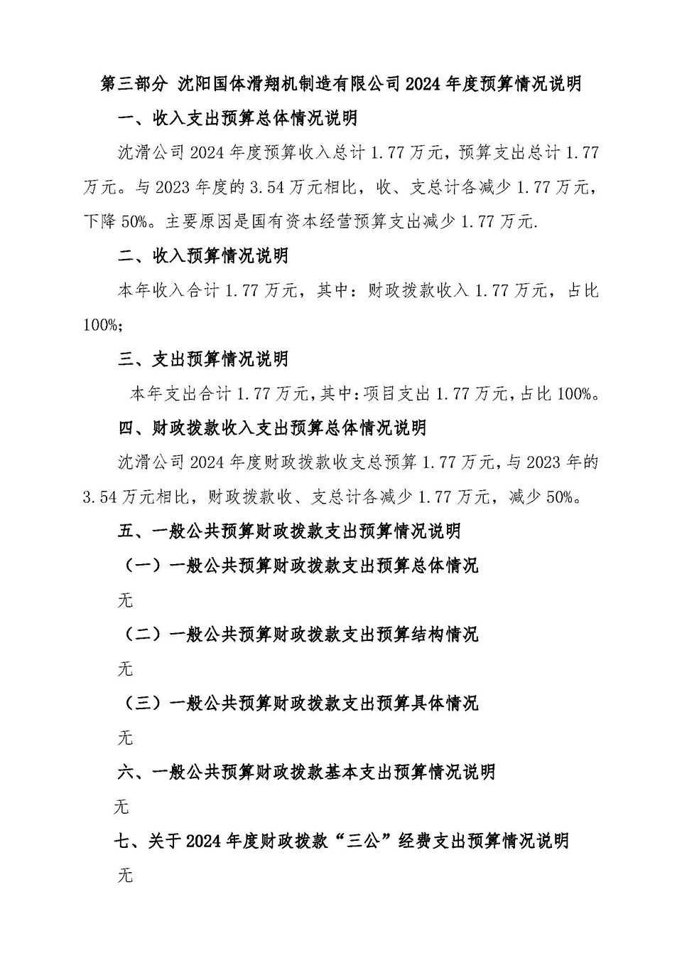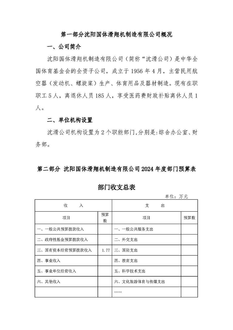 第一部分 沈阳国体滑翔机制造有限公司概况 一、单位职责 二、单位机构设置 第二部分沈阳国体滑翔机制造有限公司2024年度部门预算表 一、收入支出预算总表 二、收入预算表 三、支出预算表 四、财政拨款收入支出预算总表 五、国有资本经营预算财政拨款支出预算表 第三部分沈阳国体滑翔机制造有限公司2024年度部门预算情况说明 第四部分 名词解释